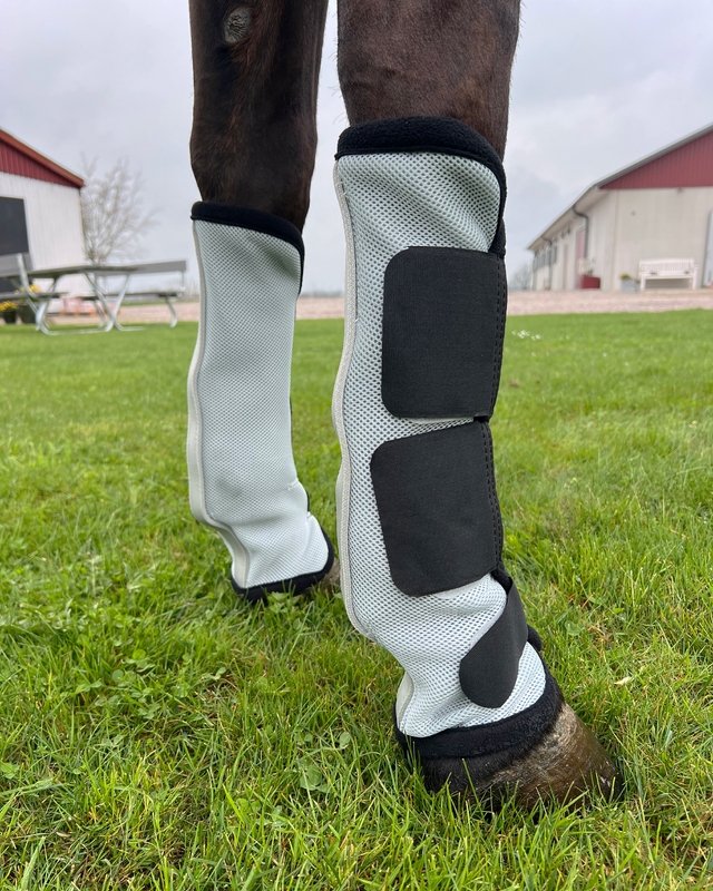 Luftiga mesh flugskydd för hästar som är känsliga för irriterande flugor och insekter kring benen. De förstärka vertikala sömmarna på baksidan av skydden håller dem säkert på plats. Lätta och ergonomiskt formade med fleecebundna kanter säkerställer överlägsen komfort medan kardborre knäppningen möjliggör perfekt anpassning kring underbenen.