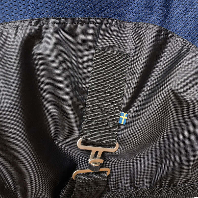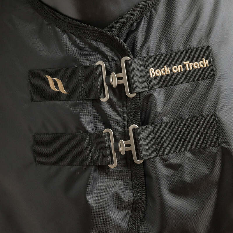 Deluxe-varianten av vårt nättäcke har en formsydd rygglinje och en ny, väldesignad anatomisk passform med dolda veck över bogarna. Ett tätt vävt tyg vid bringan minskar risken för skav och att päls fastnar. Ett mjukt fleecefoder vid manken ger extra komfort och undviker skav på manen. Täcket knäpps med dubbla bogspännen och kryssgjordar under magen. D-ringar för svansrem.