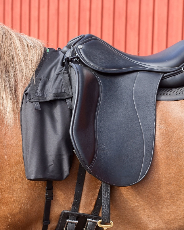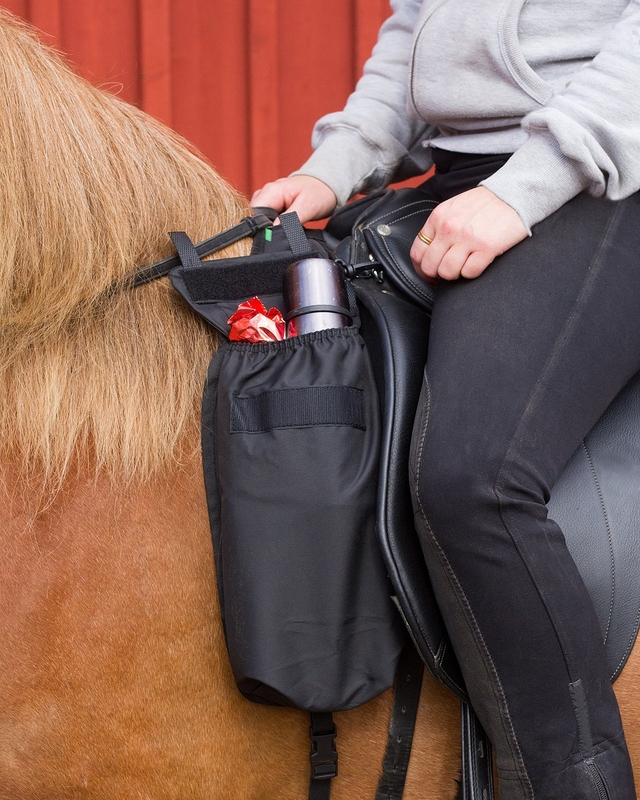 Sadelväska att sätta framför sadeln. Fästs med två hakar samt ett resårband som löper runt kroppen bakom frambenen på hästen.