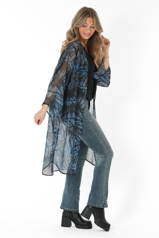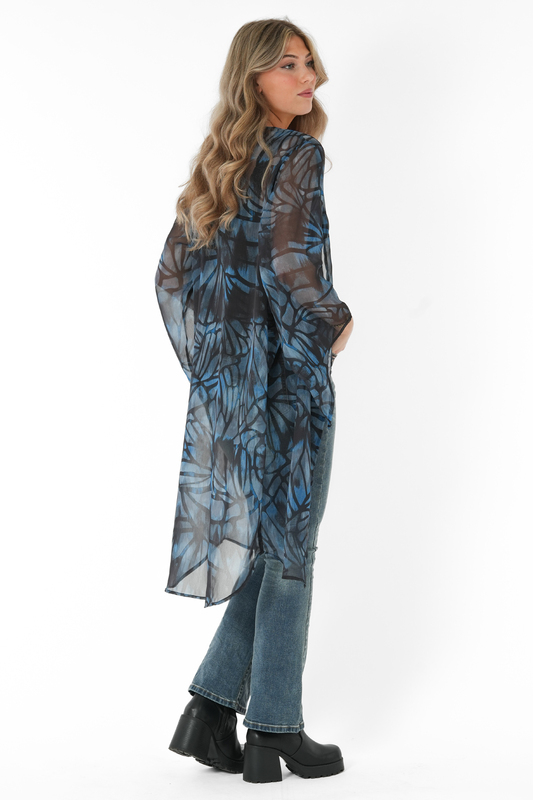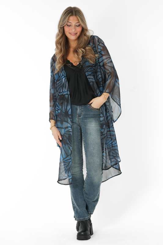 En vacker kaftan med grafiskt mönster i blåa samt svarta nyanser. Kaftanen har en lös bohemisk passform med vida ärmar med snedställt ärmavslut. Härligt luftig modell som är rundad nedtill. Kaftanen är helt öppen framtill och är gjord i en skir kvalitet. Fungerar lika bra till vardags som till fest.