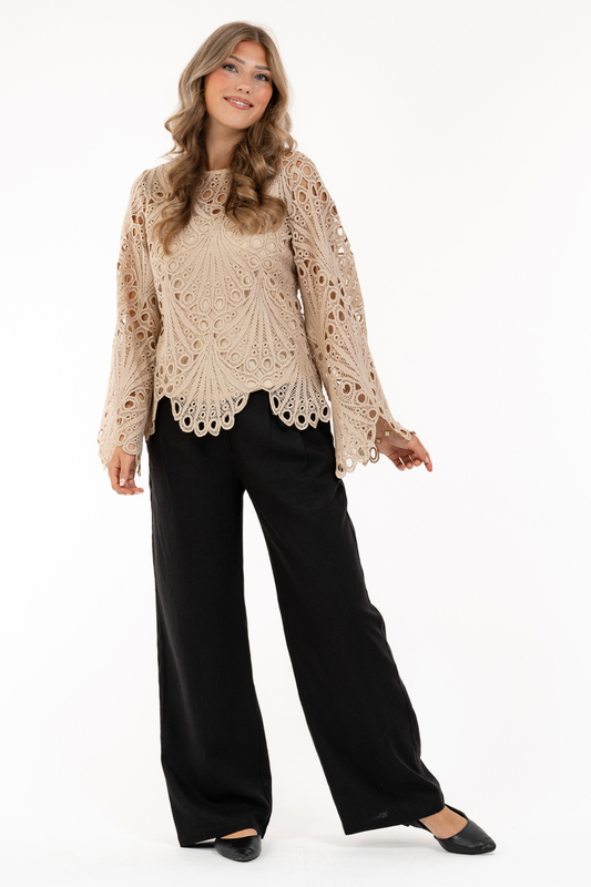 Blus gjord i en vacker bohemisk spets där både ärm och nederkant avslutas med en vågform. Ledig passform med utställda ärmar.