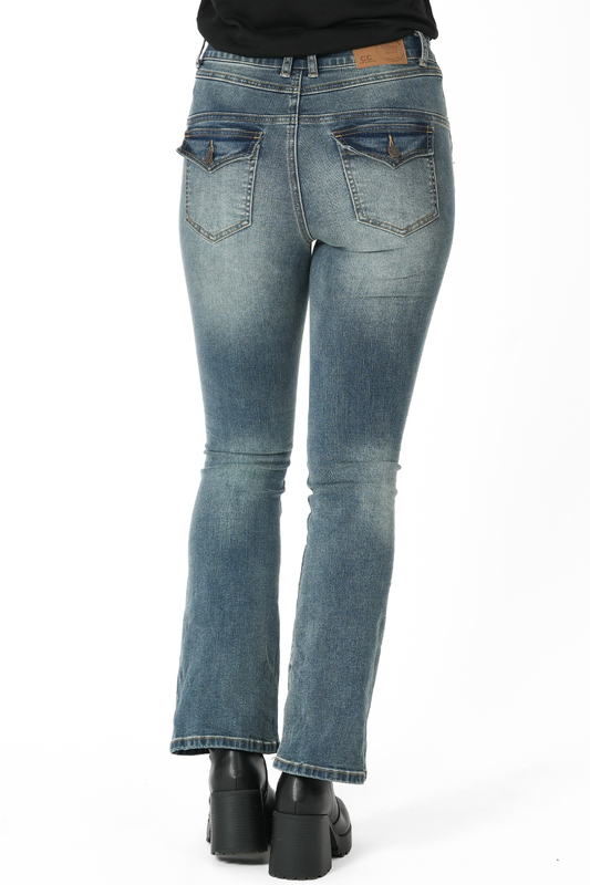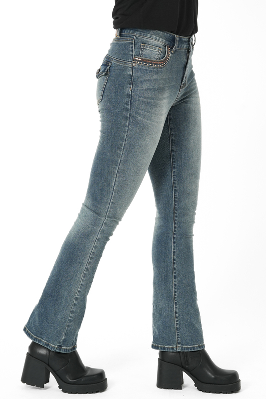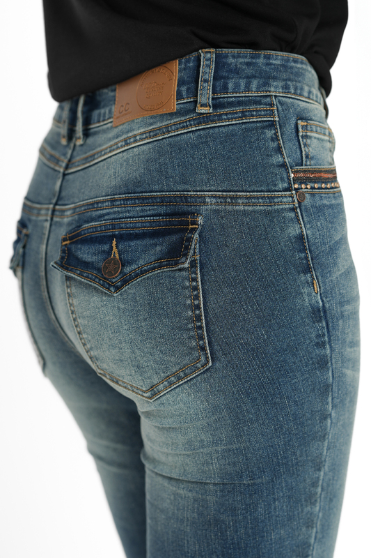 Euphoria jeans är en 5-ficksmodell med perfekta passformen gjord i ett behagligt stretchmaterial. Jeansen har dekorativa knappar i kopparfärg fram, på bakfickorna samt ficklock baktill. Detaljer med nitar i kopparfärg samt paljetter på framfickorna gör dem unika. Jeansen har en mellanblå tvätt med väl placerade och diskreta slitningar både fram och bak. Bootcut-modell som sitter figurnära vid låren och släpper efter knäna så att dem sitter mer avslappnat längs benen. Jeansen är höga i midjan. Knapp och dragkedja i gylfen.