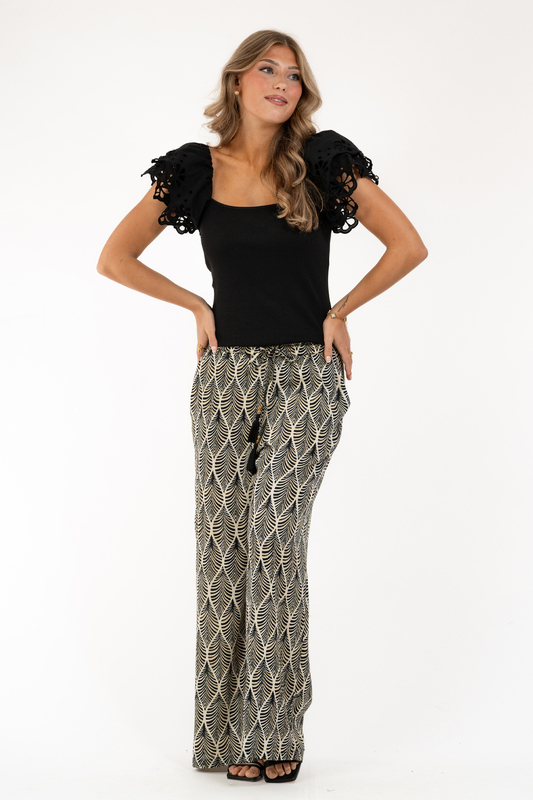 En av säsongens söta toppar! Mjuk kroppsnära trikå i body och vävt material med broderie anglaise i ärmarna. Ärmarna är dessutom gjorda i två lager volang för att ge extra volym. Vidare fyrkantig urringning både fram och bak.