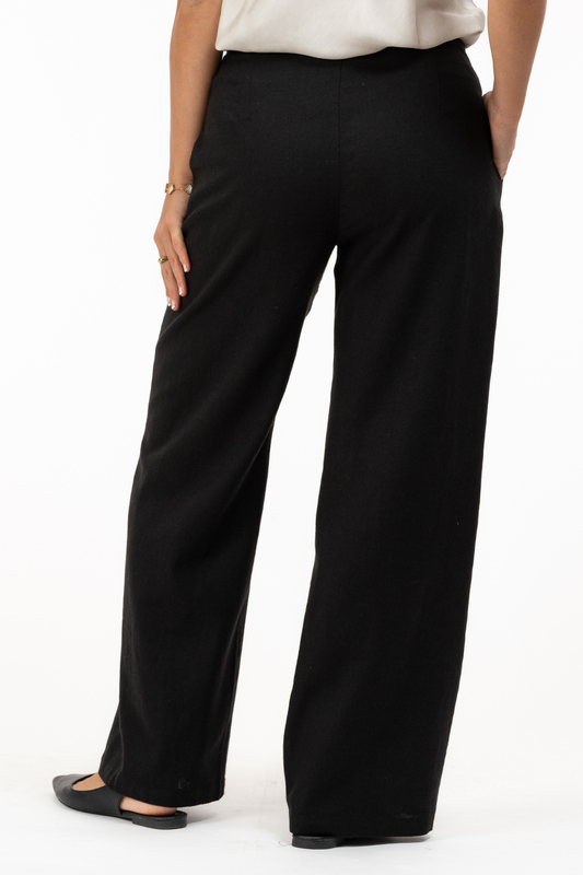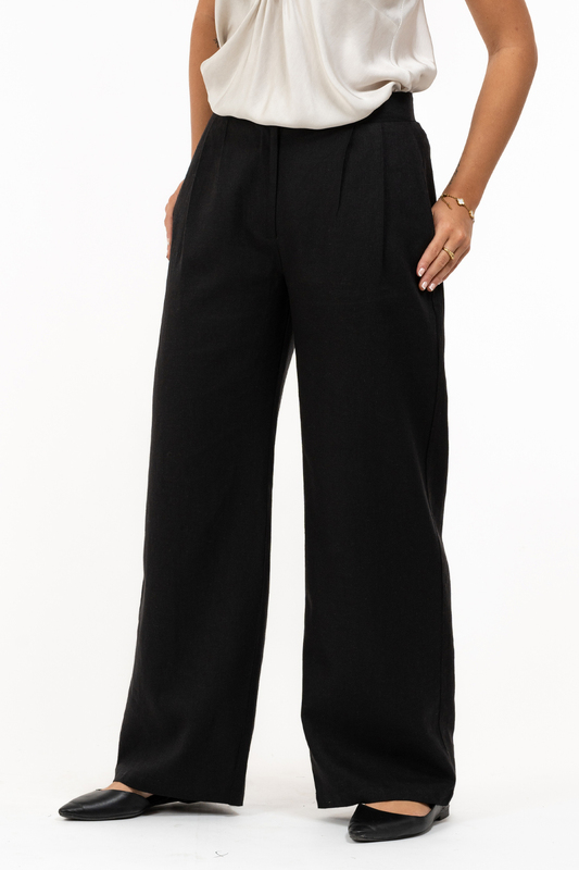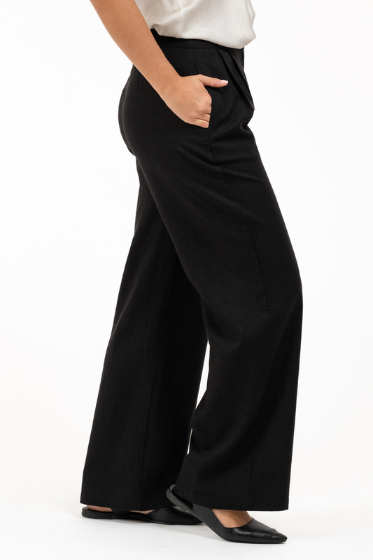 Snygg linne-look med lite bredare linning. Fullängdsbyxben med vid passform.