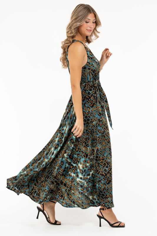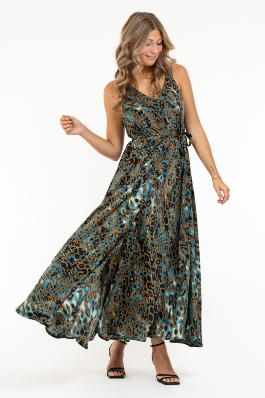 Leo inspirerat mönster i trendiga blåa toner på en kvalité med otrolig lyster, det kan inte bli bättre! Underbart ledig passform som är väl utställd redan från ärmhålet. Hög slits mitt fram och avtagbart knytband i midjan. V-ringad i halsen med ett utskuret band som ger klänningen sina axelband.