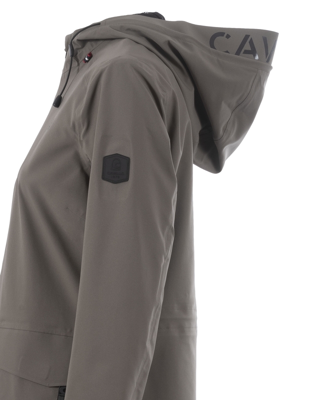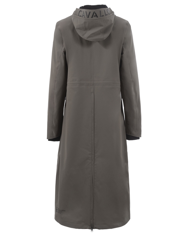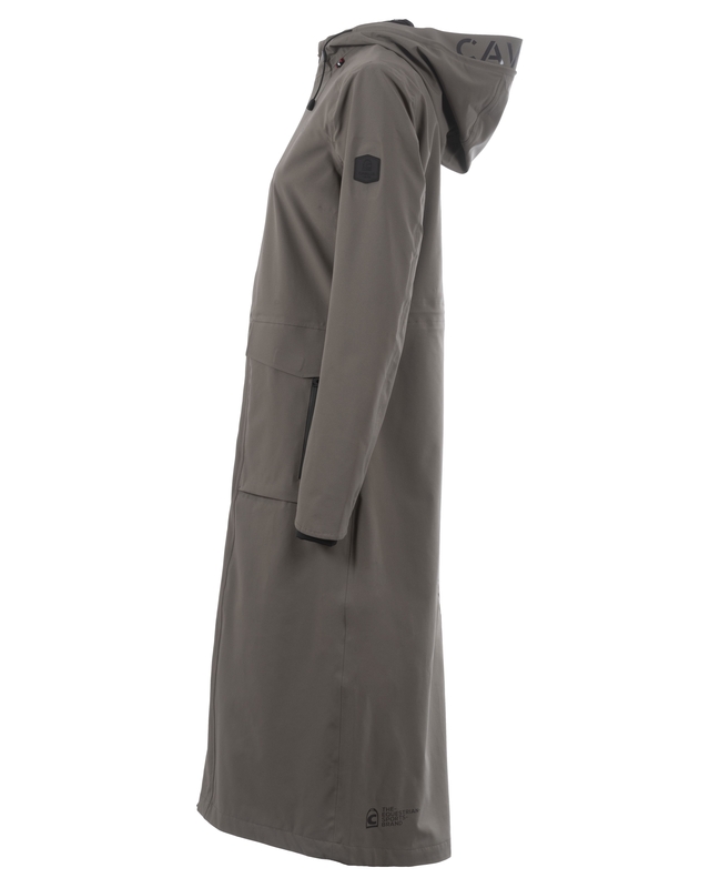 Regntålig kappa från Cavallo med tvåvägs-dragkedja fram och en dragkedja bak för att du ska kunna rida i den. Två fickor fram med dragkedja samt två utanpåliggande fickor fram.