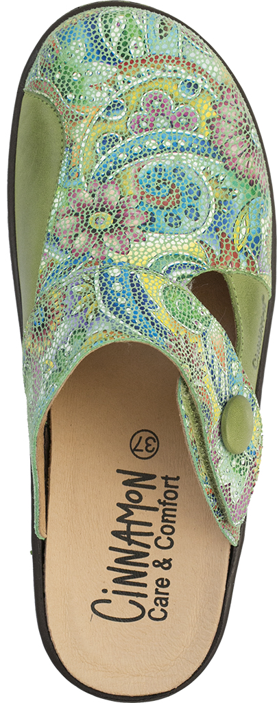 Sköna, glada clogs helt i skinn som ger bra komfort och stöd åt foten. Lädret har ett paisley mönster och en ställlbar rem på vristen. På insidan av skorna vid knölen finns en mjuk stretch-del i skinn, som anpassar sig till knölens form. Perfekt när du har en stortå som växer inåt och knölen är öm (tendens till hallux valgus). Innersulan går att ta bort när du vill lägga in dina egna inlägg. Clogs som passar bra på jobbet likaväl som hemma.