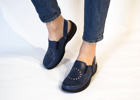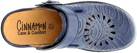 Sofia är en snygg träsko i skinn med resår över foten och fällbar rem med reglerbart spänne! Har ett fräckt perforerat mönster och präglat skinn. En härlig träsko att gå i med bra komfort och svikt.