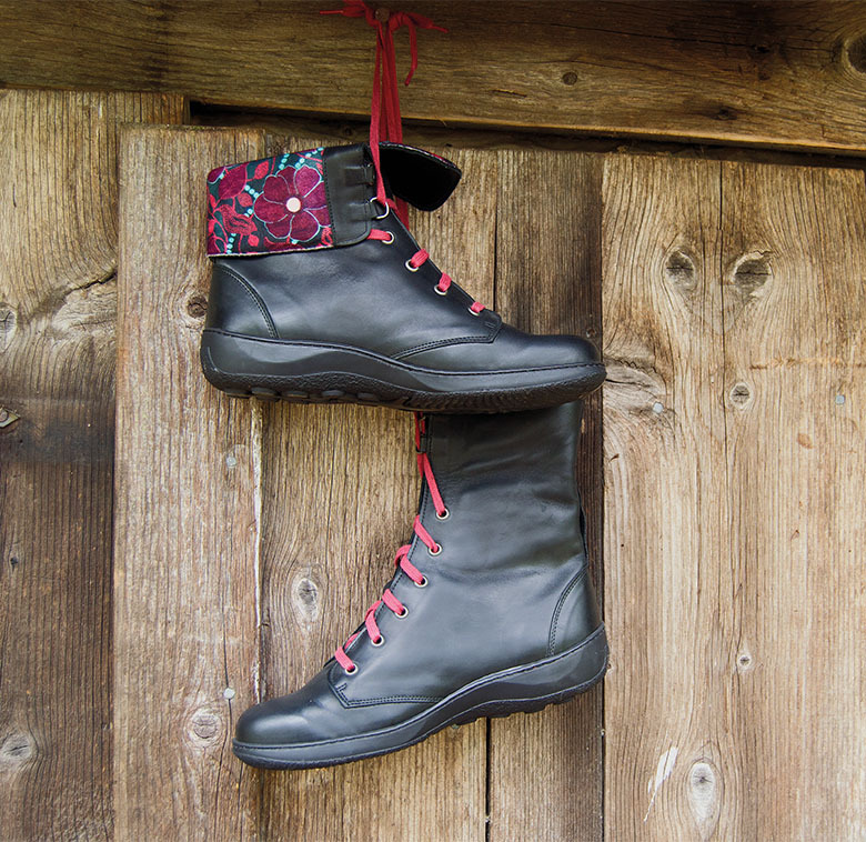 Snygg multifunktionell snörkänga i skinn med blommigt fleecefoder. Kängans kant kan fällas upp om man så önskar.