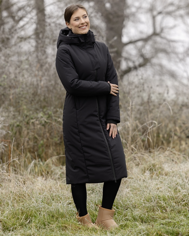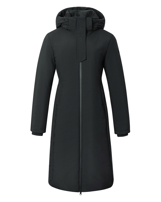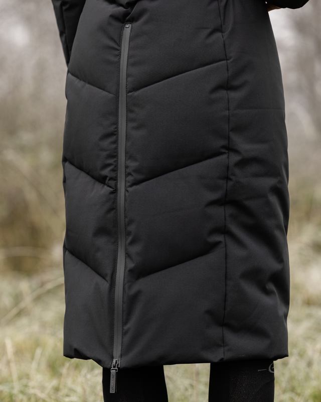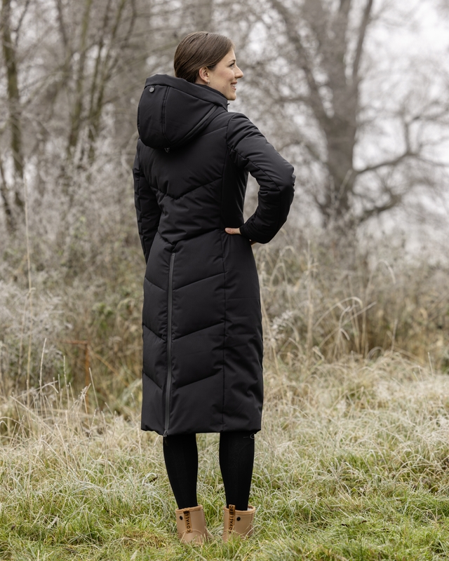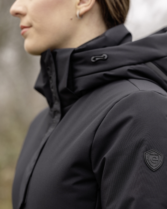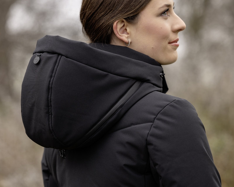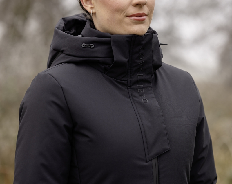 Stilren kappa från Covalliero anpassad till ridning med 2-vägsdragkedja fram och en dragedja bak. Vinterfodrad och vattentåligt tyg med tejpade sömmar. Avtagbar huva anpassad att kunna dra över hjälmen. Mjuka muddar förhindrar att regn och snö kommer in i ärmarna.