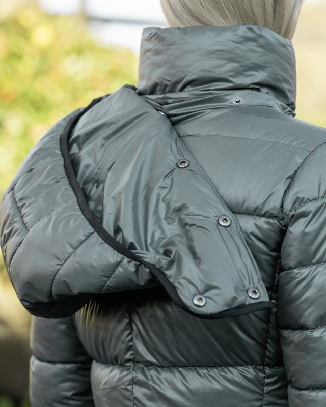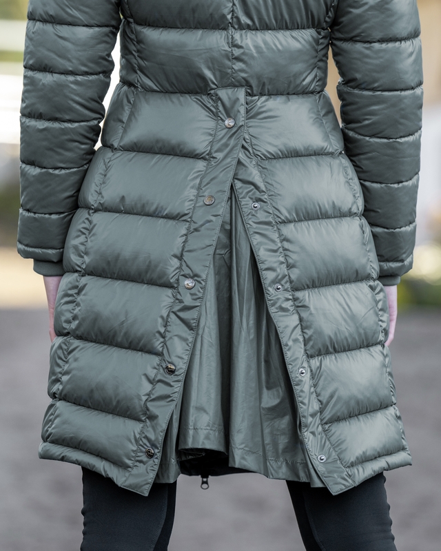 Fodrad ridkappa från Covalliero. Tvåvägsdragkedja fram och slits med knappar bak för att du enkelt ska kunna rida i den. Avtagbar huva med tryckknappar. Två fickor fram med dragkedja.