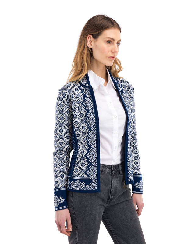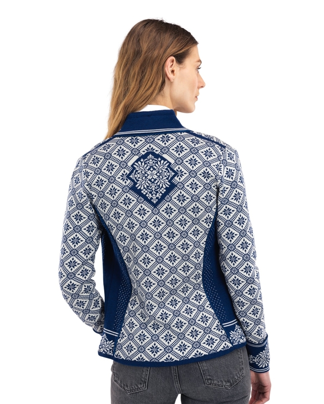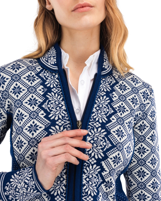 Elegant kofta i 100 % merinoull med norskt mönster. Dragkedja.