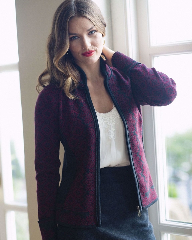 Elegant kofta i 100 % merinoull med norskt mönster. Dragkedja.