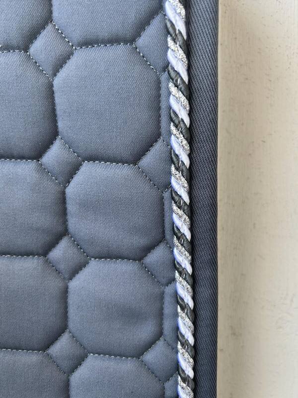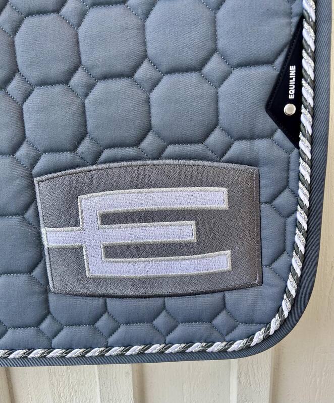 Hoppschabrak från Equiline i grått med grått kantband och en trefärgad passpoal silver/vit/grå. Den populära E-loggan med grå botten och silver/vit E på vänstersidan.