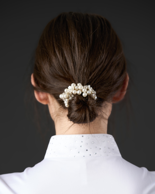 Hårband med dekoration av pärlor, blommor och paljetter. Håller håret på plats under tävlingen.