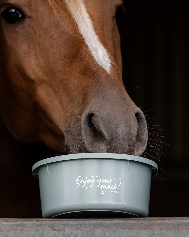 Liten foderskål med texten "Enjoy your snack". Med tillhörande vitt tätslutande lock. Livsmedelsgodkänd plast.
