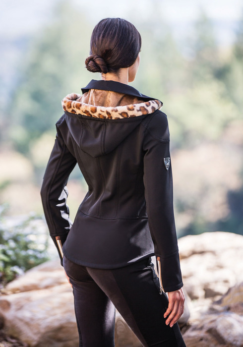 This water resistant, stretch Poly/Spandex jacket will keep you warm, dry and cozy yet super stylish. Flattering princess seaming gives a beautiful streamlined silhouette. Removable Hood with faux leopard fur. 2 way zipper in front , pocket zips in front and chest with leather pull tabs. Soft fur fleece lining inside. Style meet function!