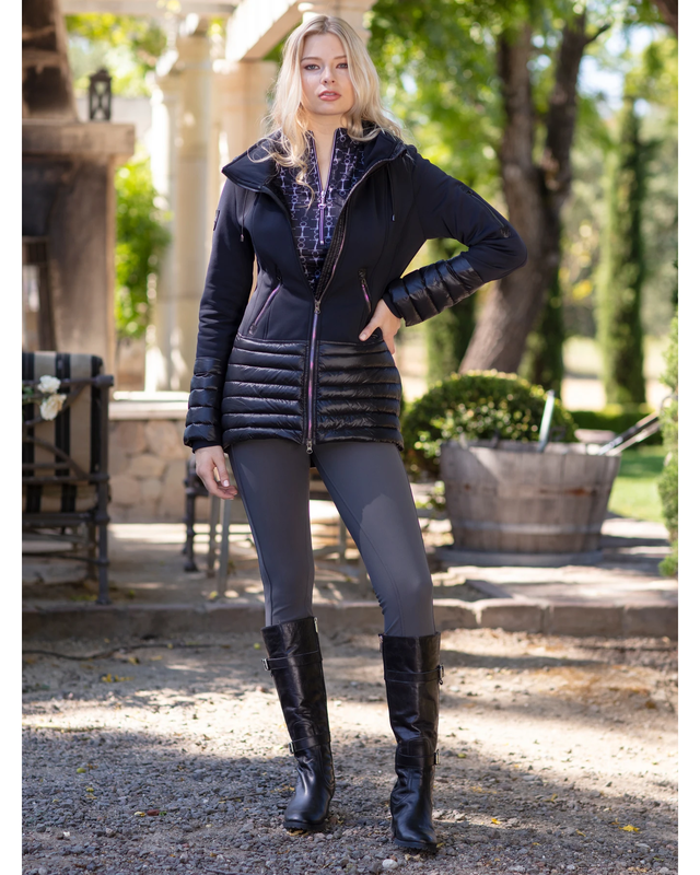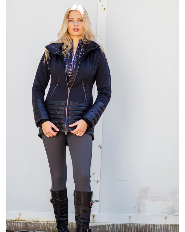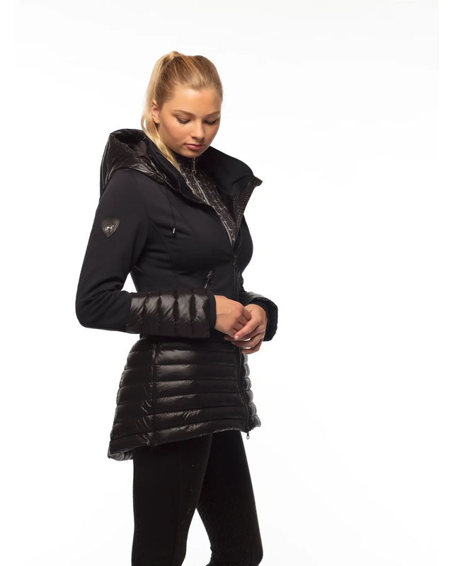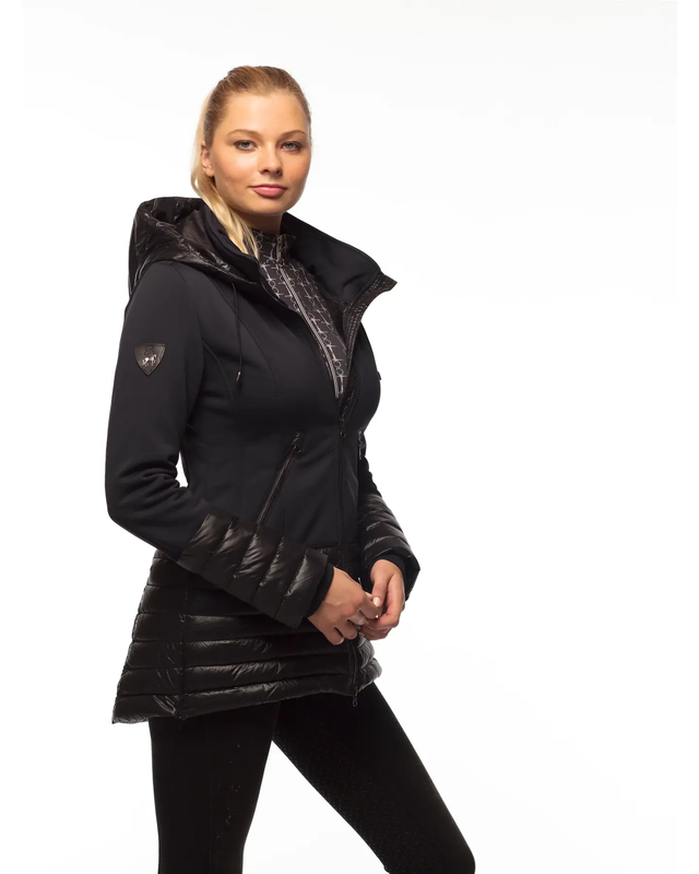 Hybridjacka med ovandel i softshell-material och mjukt fleecefoder. Nederdel, manchetter och huva vaddstickade i vattentåligt material. Dolda dragkedjesprund på sidorna som kan öppnas.