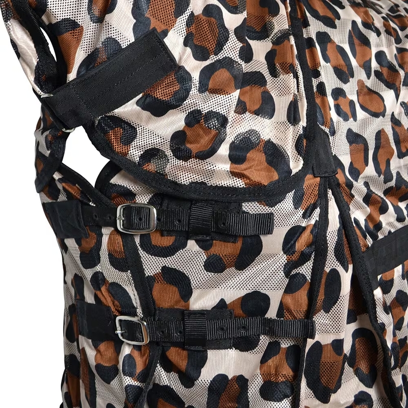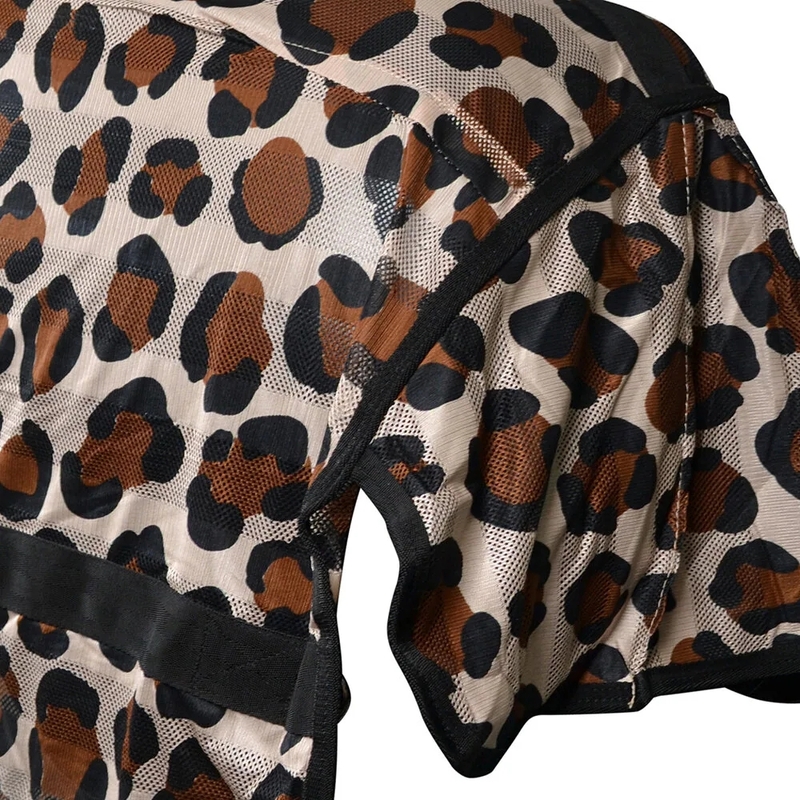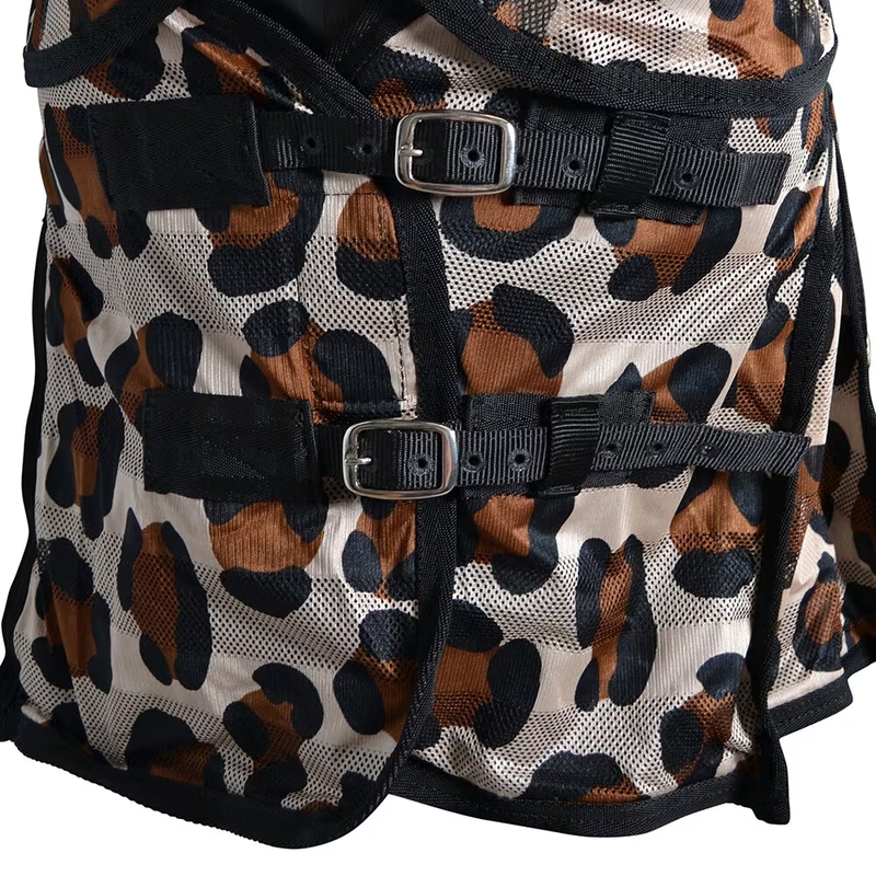 Flugtäcke i 100% polyester mesh med lekfullt leopardmönster. Nylonfoder i bogpartiet för att motverka skav. Dubbla justerbara frontspännen, bogveck, bensnören och svansrem. Fast kombohals som försluts med kardborre under hals och nacke.