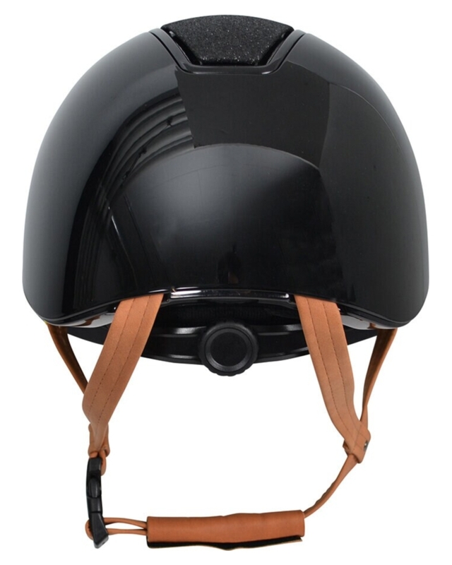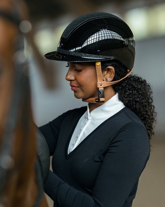 Ridhjälm med implementerat Mips-system. Elegant glansig hjälm med bred solskärm och gnistrande glittrande panel samt vackert glitterband runt skärmen. Designad med totalt sex ventilationsöppningar. Justerbart hakband i exklusivt brunt konstläder med trepunktsfästen samt snabbspänne. För optimal passform justeras storleken enkelt baktill med hjälp av rattsystemet. Avtagbart innerfoder av Cooldry-material, som torkar snabbt och håller huvudet svalt. Tillverkad av premium polykarbonat och utrustad med innovativt integrerat nässkydd.