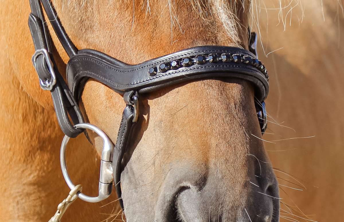 Nosgrimma-del från Hilbar med en rad av svarta stenar över nosen. Anatomisk utformad. Blank-svarta spännen. Passar de flesta kombinationsträns.