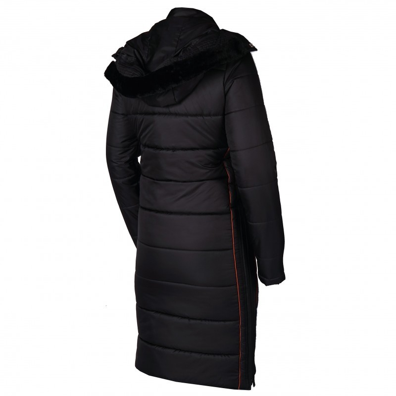 Varmfodrad och vattenavvisande kappa från Horka. Slitsar i sidorna. Två fickor med dragkedja. Tvåvägsdragkedja fram samt knappstängning. Avtagbar huva med avtagbar fuskpäls