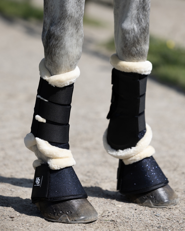 Fina benskydd från Horse Guard med glittrig utsida. 3D mesh insida samt konstpäls runt kanterna för att förhindra skav. Öppnas och stängs med kardborre.