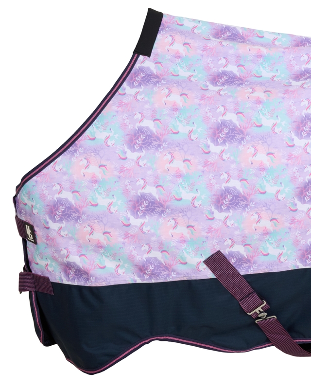 Regntäcke från Horse Guard med gulligt mönster. 600D ripstop polyester som är 5000mm vattenpelare och 5000 mvp breathable. 0G fyllning. Dubbla bogspännen och kryssgjordar. Svans-rem och elastiska bensnören.