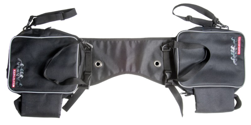 Smart rymlig sadelväska från Karlslund. Med spännen för att fästa i sadeln och hållare för flaskor.