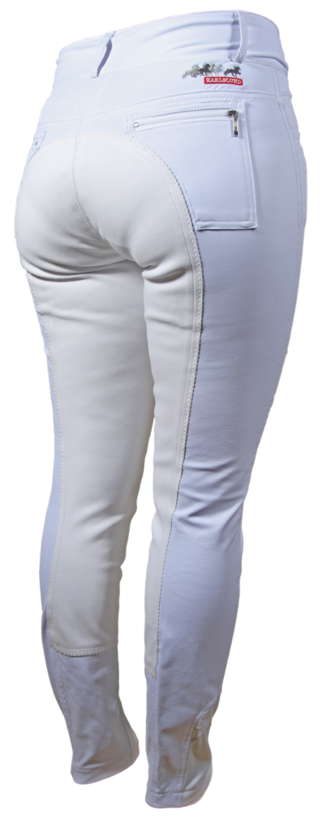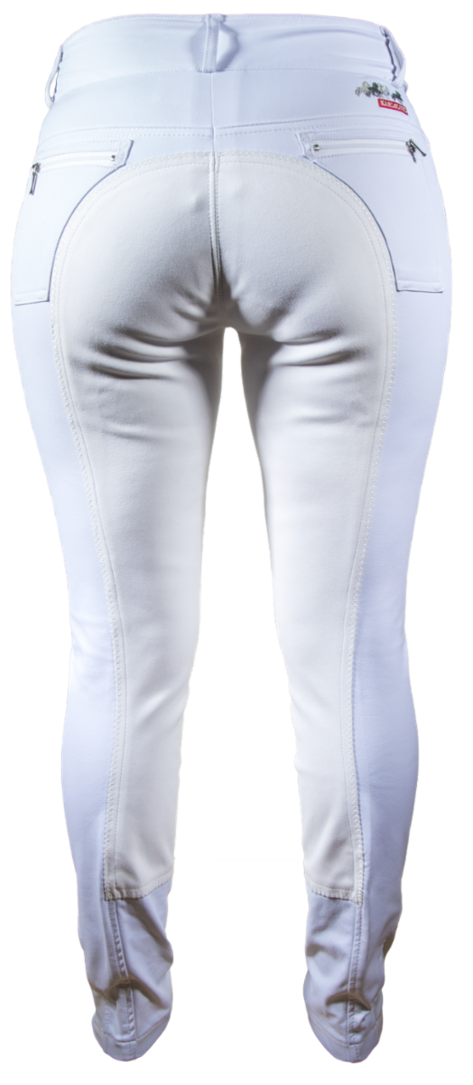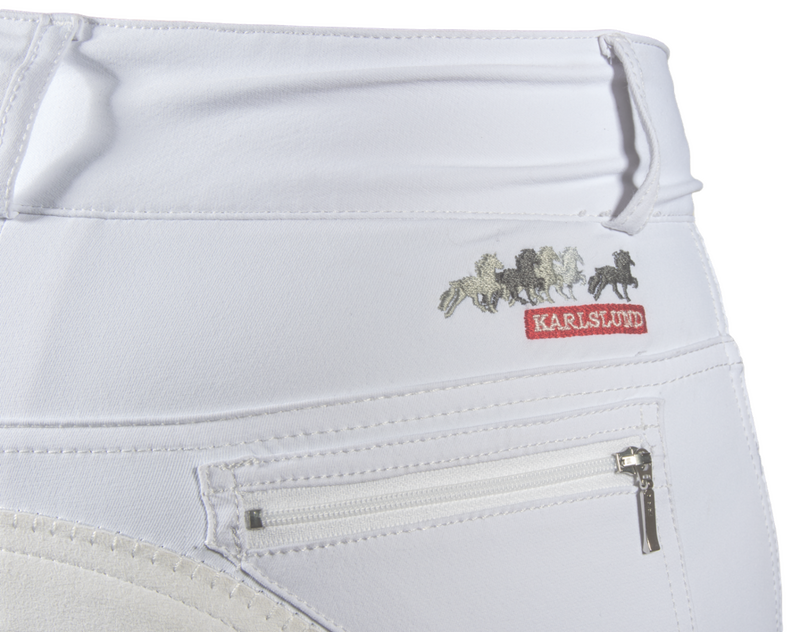 White competition breeches with full seat in absolute top quality. Made in very nice 4-way stretch and dirt repelling fabric. Elastic leg opening for use with long riding boots. These breeches have a good and very popular fit, as well as a good comfort. Two pockets in the front, and icelandic horse embrodidery and two pockets on the rear.