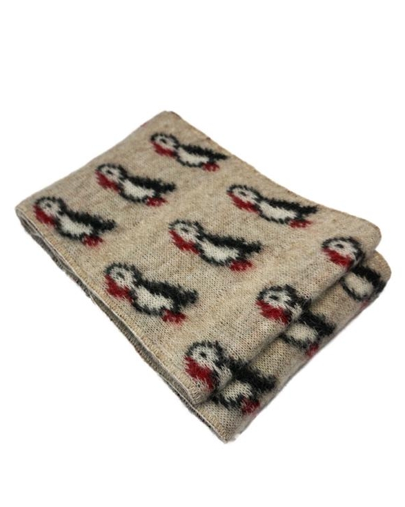 Varm stickad scarf i isländsk ull. Motiv av lunnefågel.