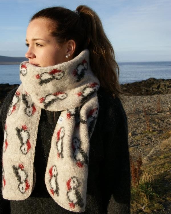 Varm stickad scarf i isländsk ull. Motiv av lunnefågel.