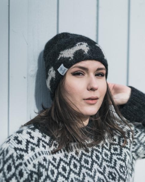 Stickad ullmössa med hundmotiv. Tillverkad på island.