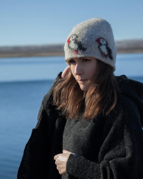 Stickad ullmössa med motiv av Lunnefågel. Tillverkad på island.