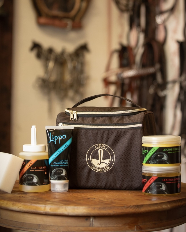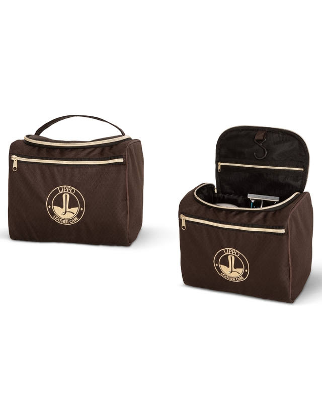 Produkterna levereras i en snygg och praktisk väska som är enkel och smidig att ta med sig, väskan kan även hängas upp med hjälp av kroken på insidan locket. Väskan innehåller allt du behöver för att underhålla och ta hand om dina läderprodukter. En smart väska med många fack för att hålla ordning på dina lädervårdsprodukter, denna väska är även en uppskattad present till ryttaren.