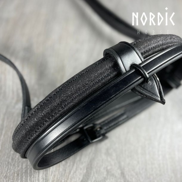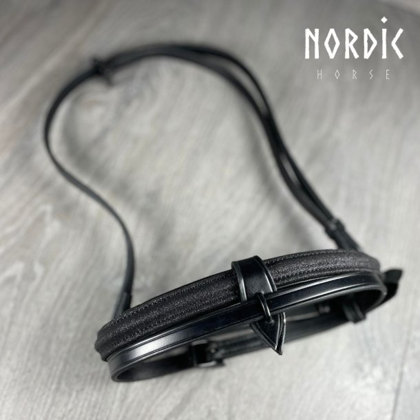 Engelsk/kombinerad nosgrimma från Nordic-Horse dekorerad med svart glitter över nosen. Mjukt fodrad. Avtagbar snokrem.