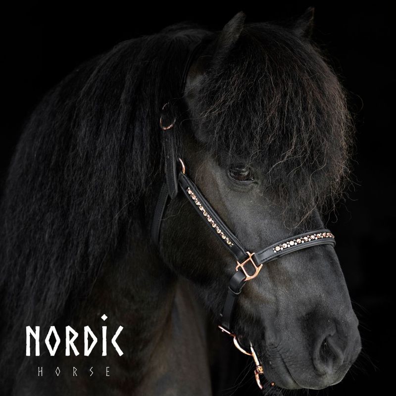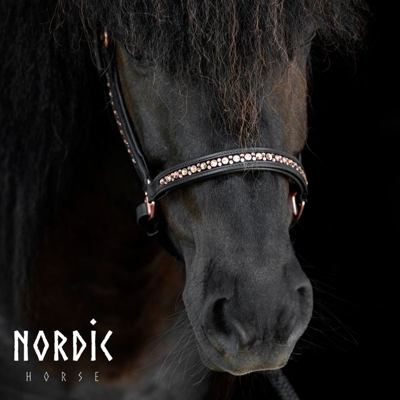 Lädergrimma med stenar och spännen i rosegold-färg. Nackstycket går att justera på båda sidor.