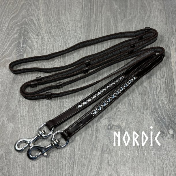 Brun supergrepptygel med invävda gummitrådar och stoppar från Nordic Horse. Dekorerad med vita strass-stenar. Silverfärgade pistolhakar.