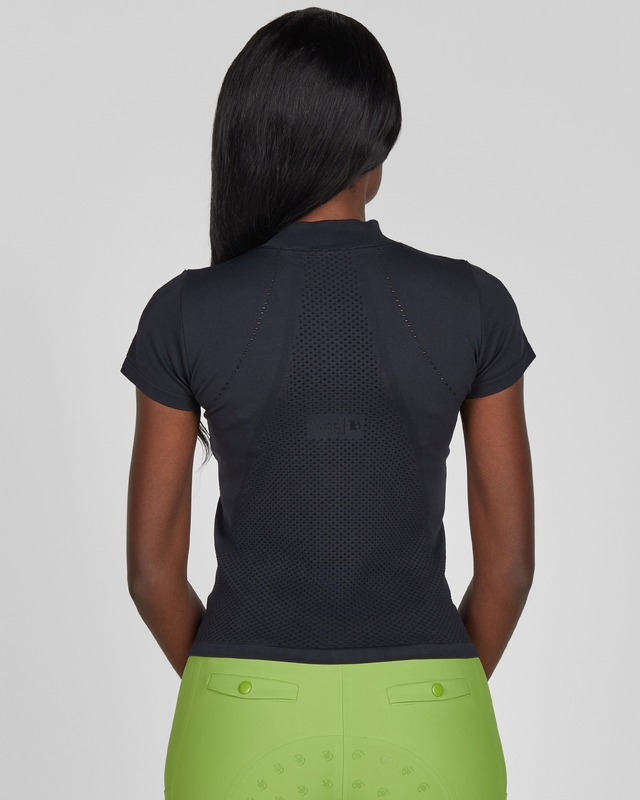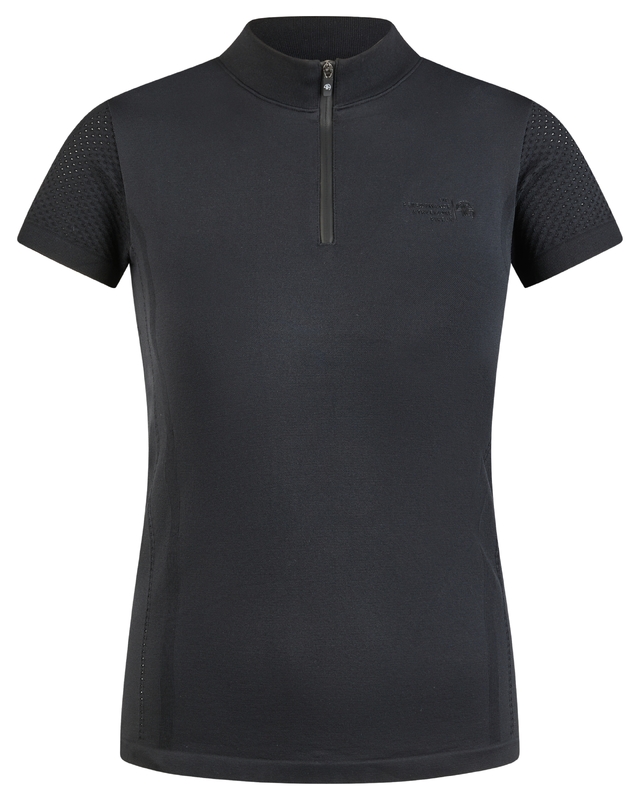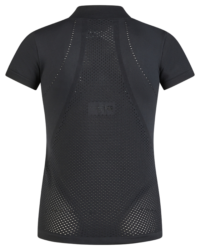 Ultramjukt material som anpassar sig efter kroppen. Kroppsnära passform. Kort dragkedja i halsen. Partier med varierande stickstruktur och lasercut-fält. Ton-i-ton-tryck i silikon på bröstet och ryggen.