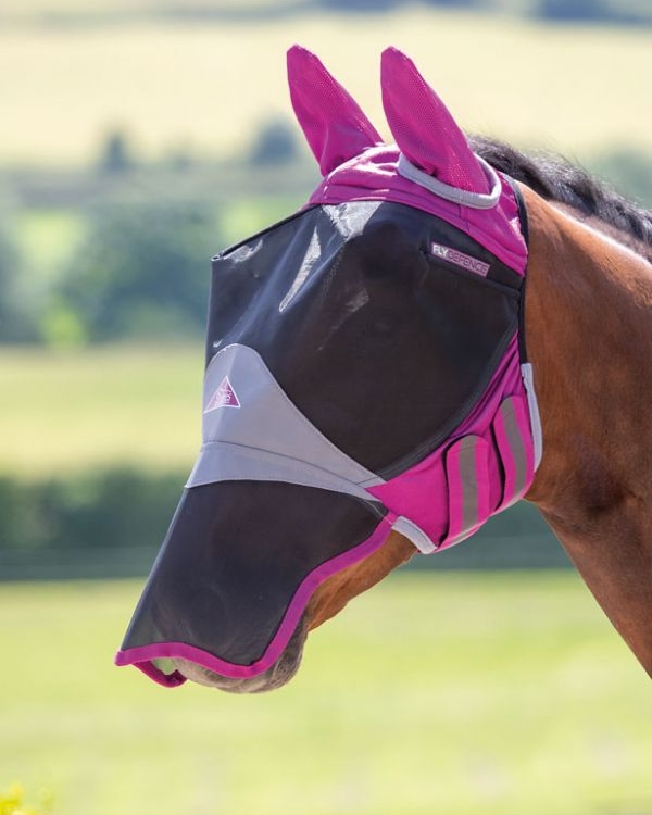 Shires flughuva med öron och nos. De förstärka vecken med skenor, garanterar fritt utrymme kring ögonen. Meshen är finmaskig men i kraftigare material. Perfekt passform via elastisk nacke och två knäppen runt ganascherna. Vadderad insida minskar risken för skav. Vecken vid ögonen frigör att materialet kommer i kontakt med hästens ögon. 70+ % UV skydd.