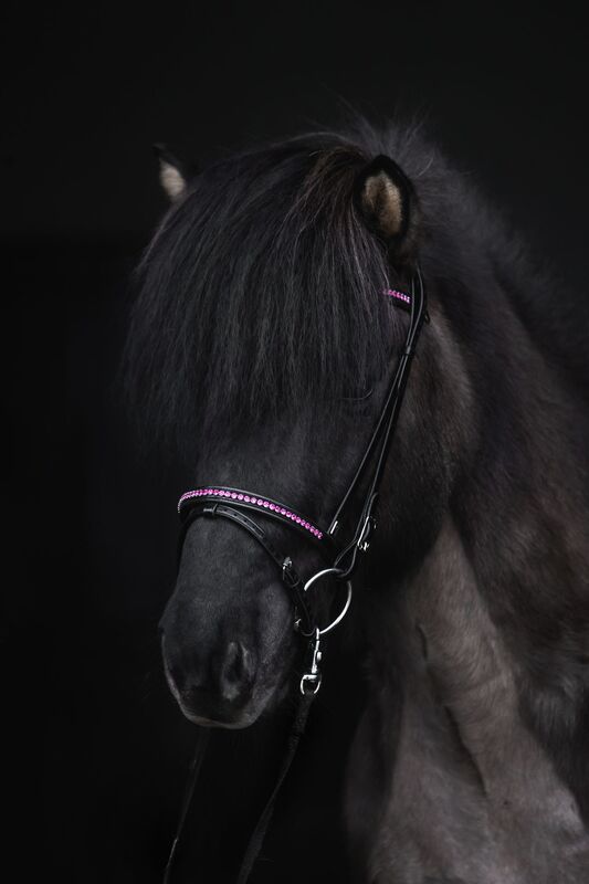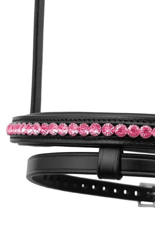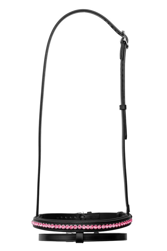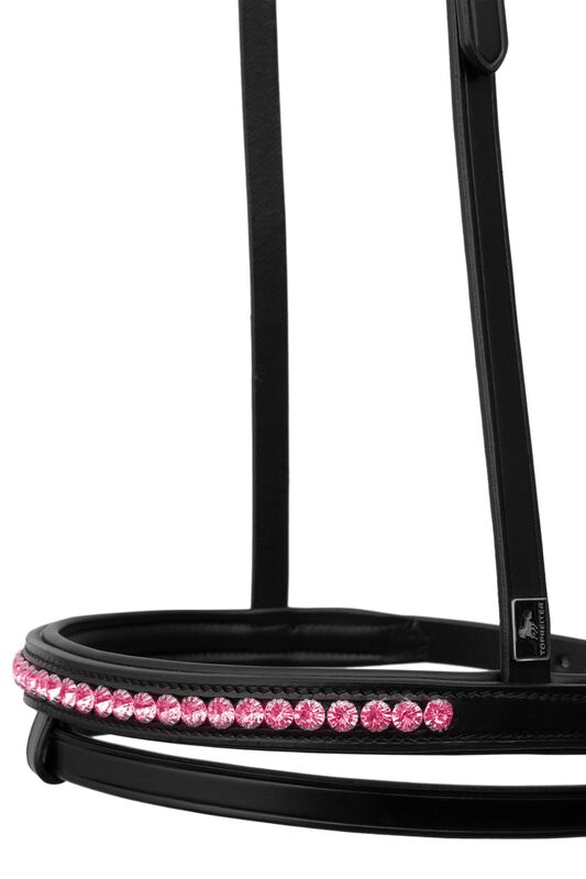 Engelsk/kombinerad nosgrimma från Top Reiter dekorerad med rosa stenar över nosryggen. Fint kvalitétsläder. Spännen i silver