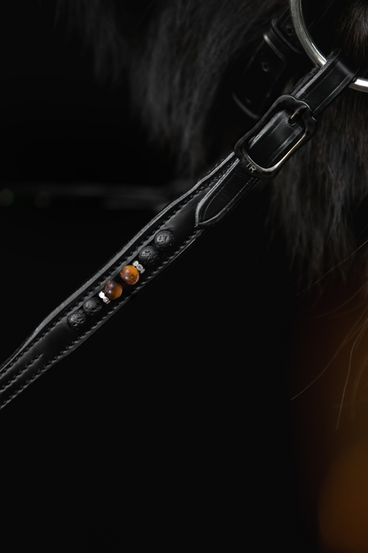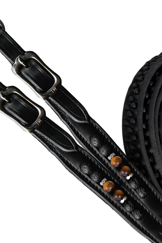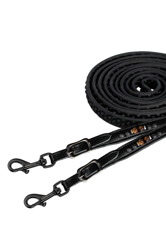 Knottrig gummitygel från Top Reiter dekorerad med bruna stenar, lavastenar och strass. Svarta avtagbara pistolhakar.