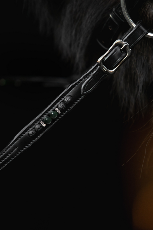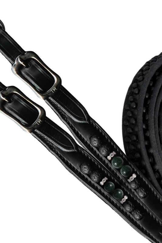 Knottrig gummitygel från Top Reiter dekorerad med gröna stenar, lavastenar och strass. Svarta avtagbara pistolhakar.