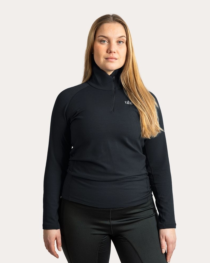 Mjuk och skön ridtröja i merinoull designad i ett klassiskt enkelt snitt. Ulltröjan är ett perfekt värmande mellanlager men passar även bra som ett tjockare baslager tack vare den mjuka insidan. Tröjan har en figurnära passform och modern design med hög krage där dragkedjan är lite snedställd för att inte hamna precis under hakan och skava.